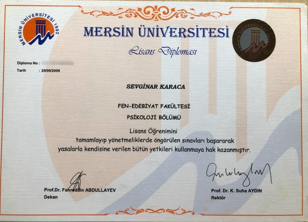 Lisans eğitimimi Mersin Üniverisitesi Fen Edebiyat Fakültesi Psikoloji bölümünde tamamladım.