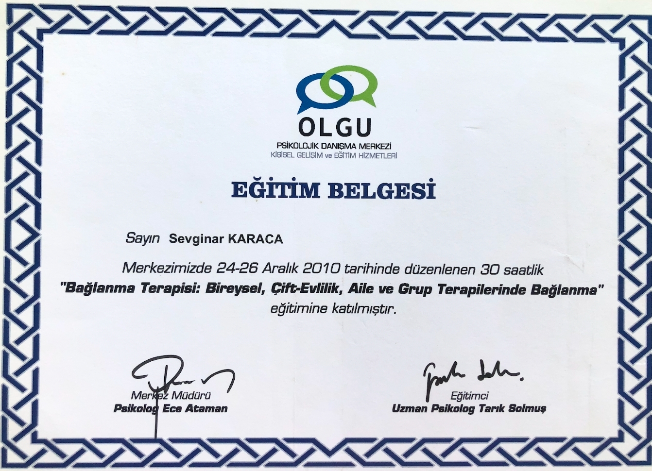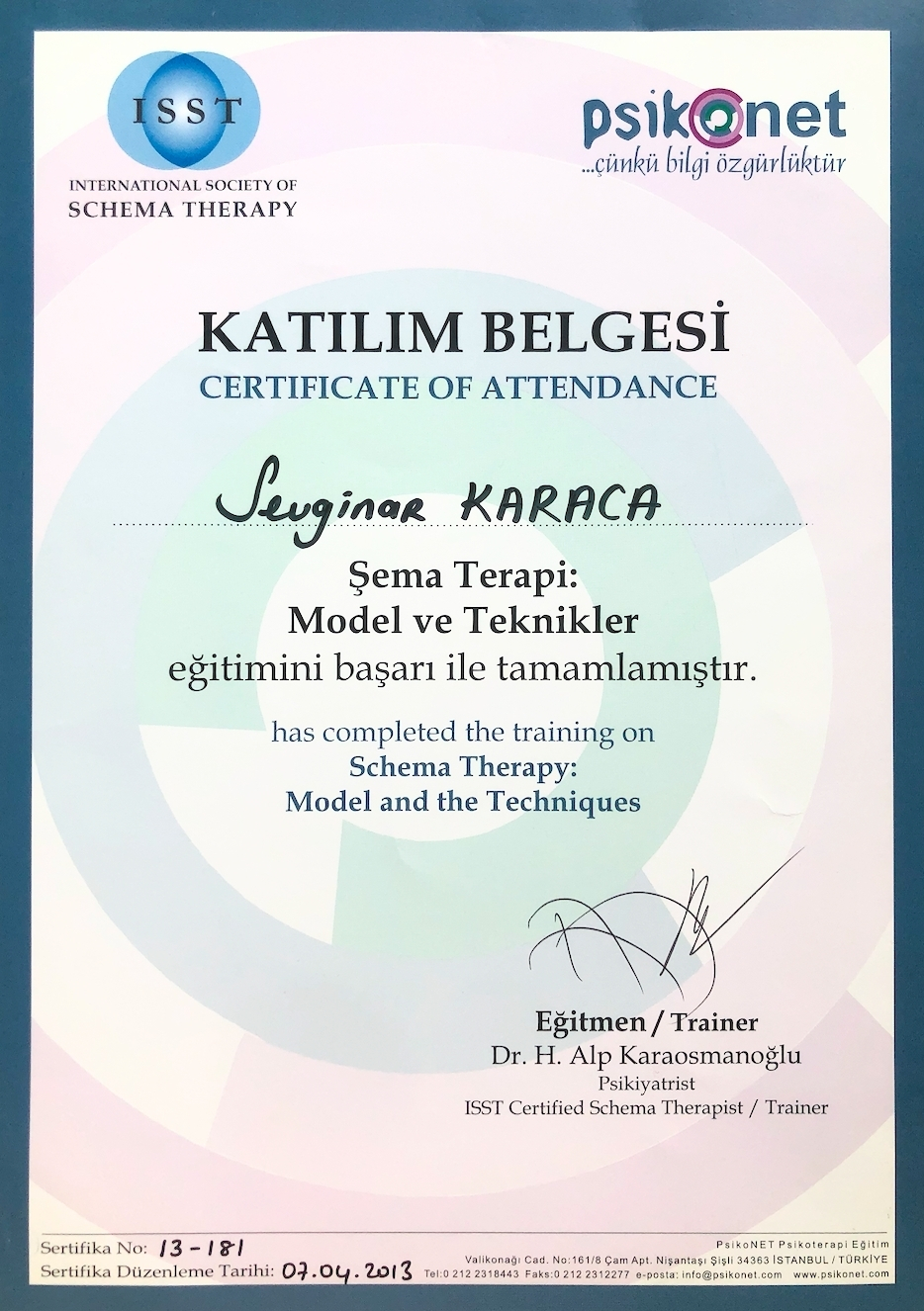 Lisans mezuniyetim sonrasında yıllar içinde psikiyatrist Dr Alp Karaosmanoğlu’ndan Şema Terapi ,